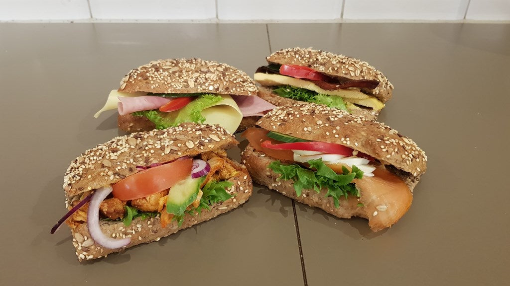 Våre hjemmebakte grove briks fylles med assortert pålegg.